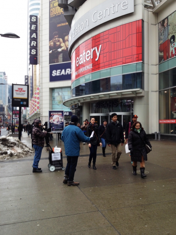 On December 28th, 2013, a team from Messiah Foundation Canada went to Dundas Square, Toronto to spread the message of divine love and spirituality. Many people stopped to listen to our message, view the divine signs of the Awaited One His Divine Eminence Gohar Shahi and take our literature!