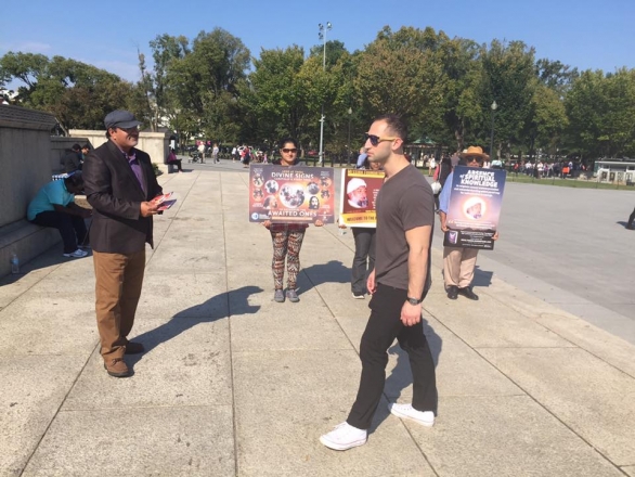 Lincoln Memorial, an American national monument located on the western end of the National Mall in Washington, D.C, is a major tourist attraction. A team from Messiah Foundation USA often visits to spread the universal message of divine love. On their recent trip to the Lincoln Memorial, thousands of leaflets were distributed. Our members showed large banners illustrating the divine signs of the Awaited One on the Moon, Sun and Holy Black Stone.