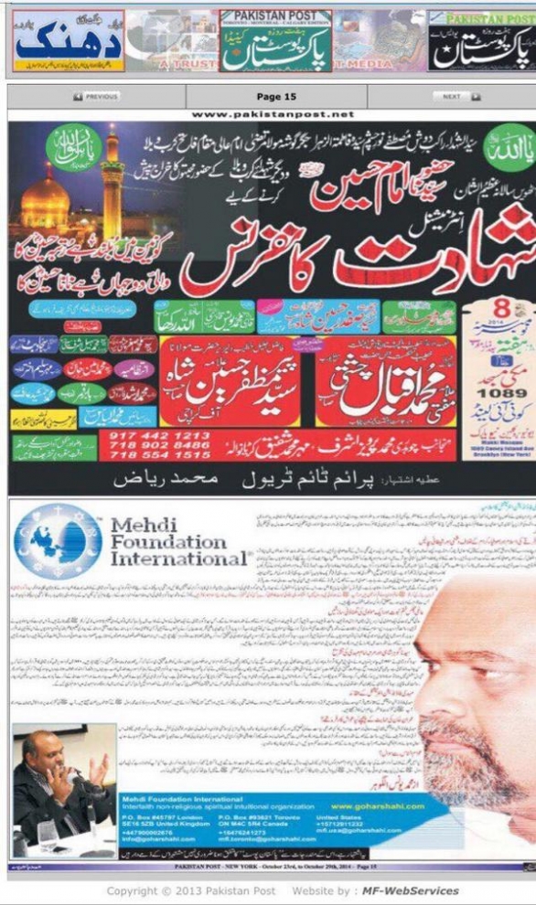 In order to dispel false rumours and allegations circulating in the Pakistani media regarding Younus AlGohar and Mehdi Foundation International (MFI), MFI issued a press release. In the United States of America, the Pakistan Post and the Urdu Times (New York, USA) published our press release.